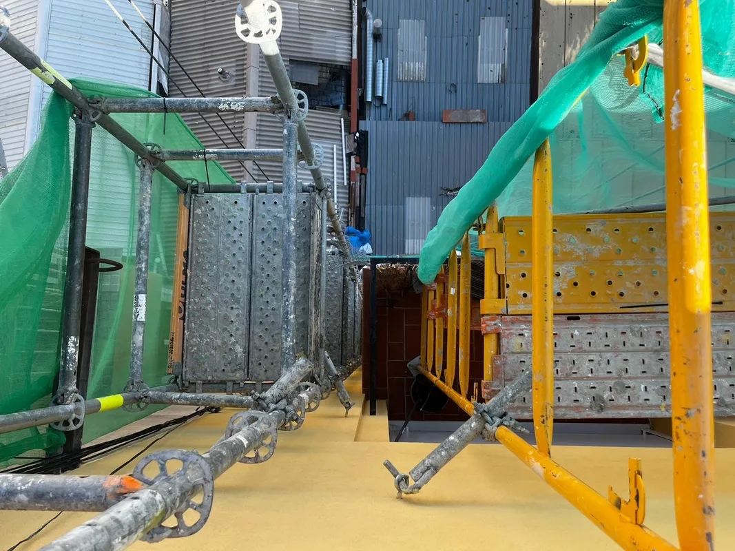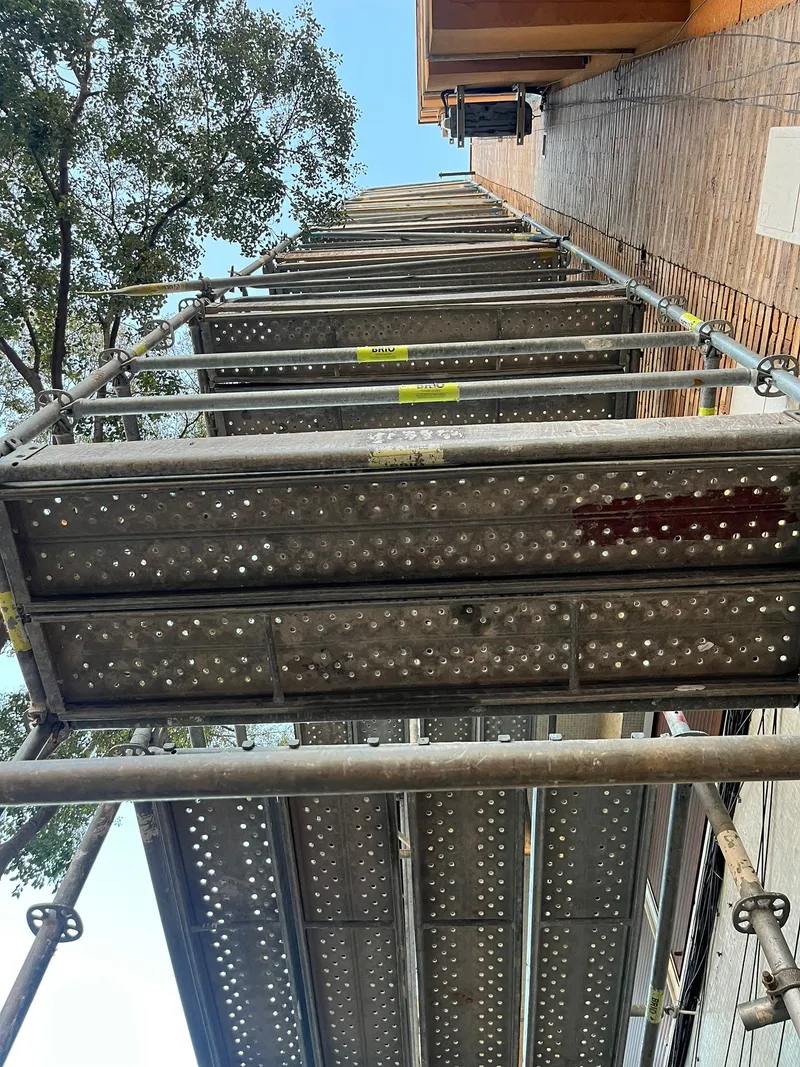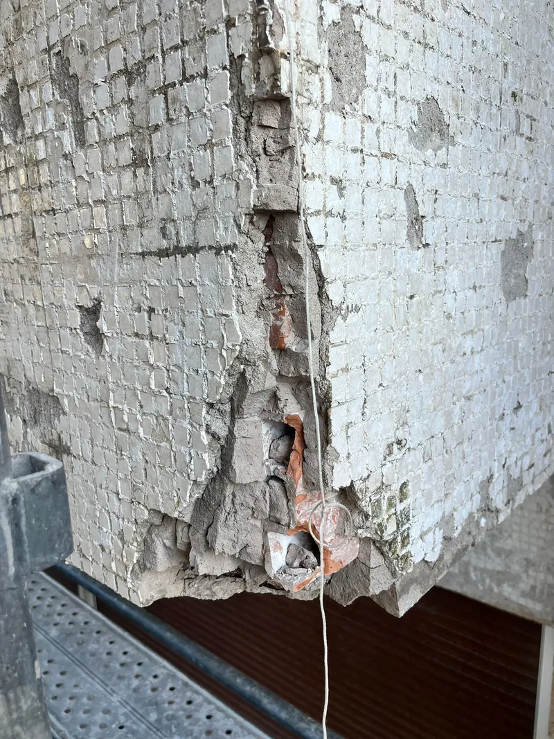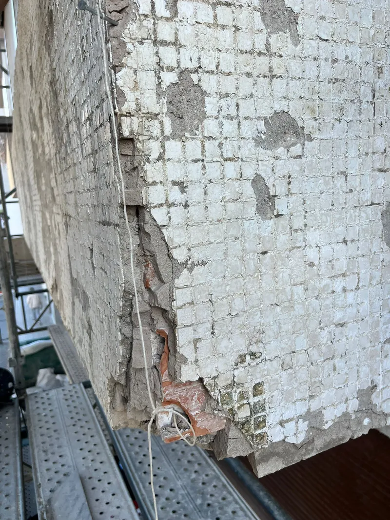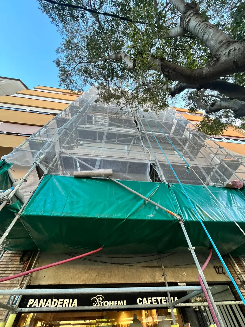 El edificio presentaba un estado de deterioro en su fachada, con desprendimientos de revestimiento hacia la vía pública que obligaron a tomar medidas cautelares de seguridad.