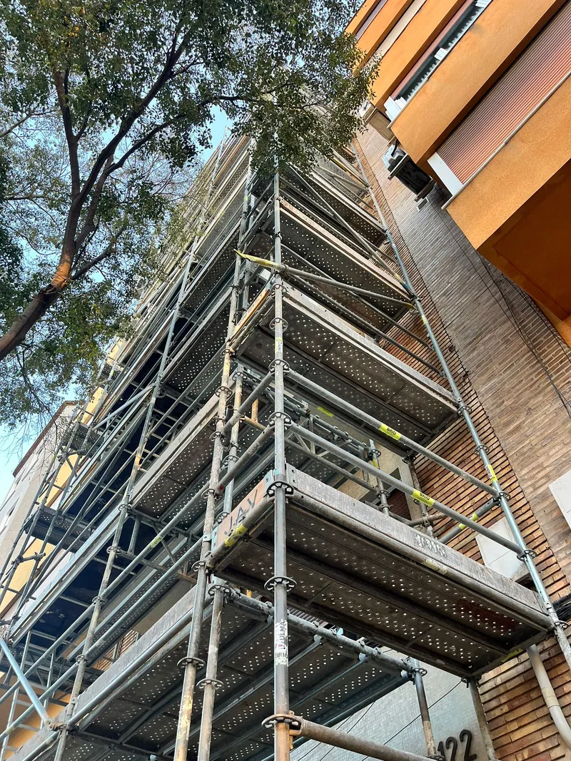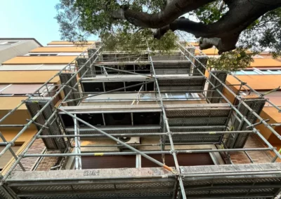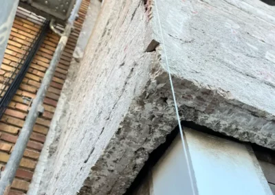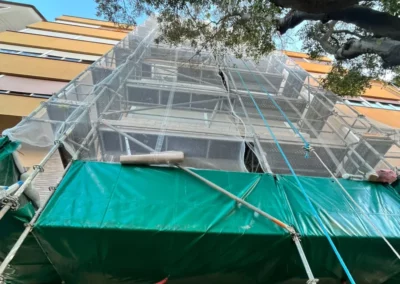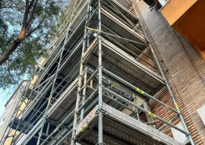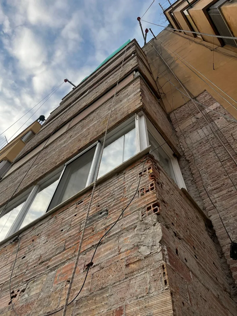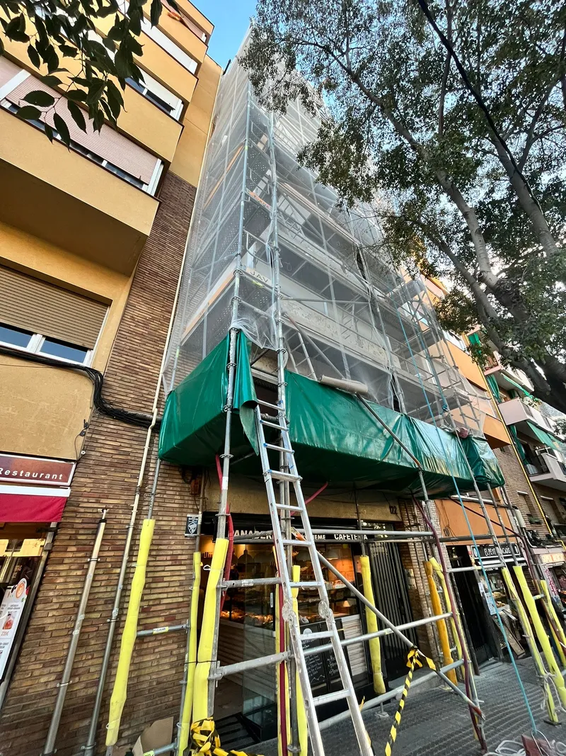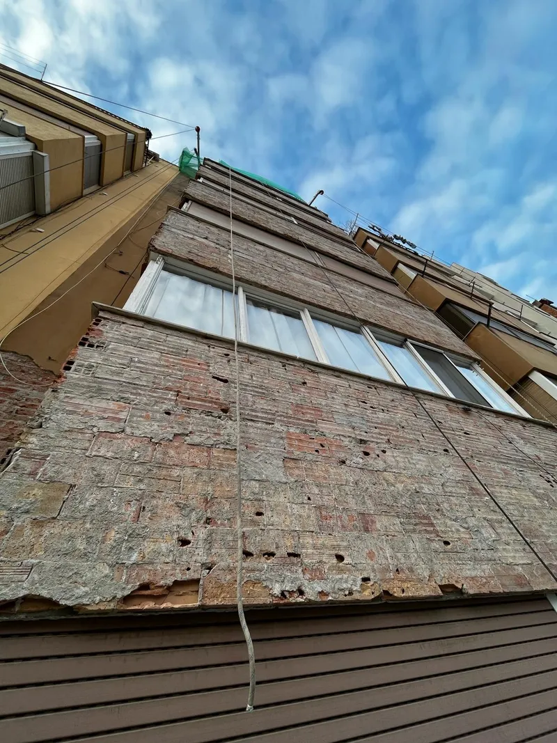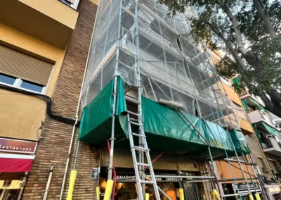 Fachada con desprendimientos y afectación patrimonial. Proyecto técnico, dirección de obra y coordinación de seguridad en Barcelona.